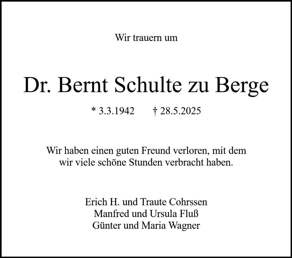 Dr. phil. Bernt Schultegestorben am 28. Mai 2025