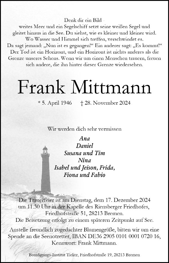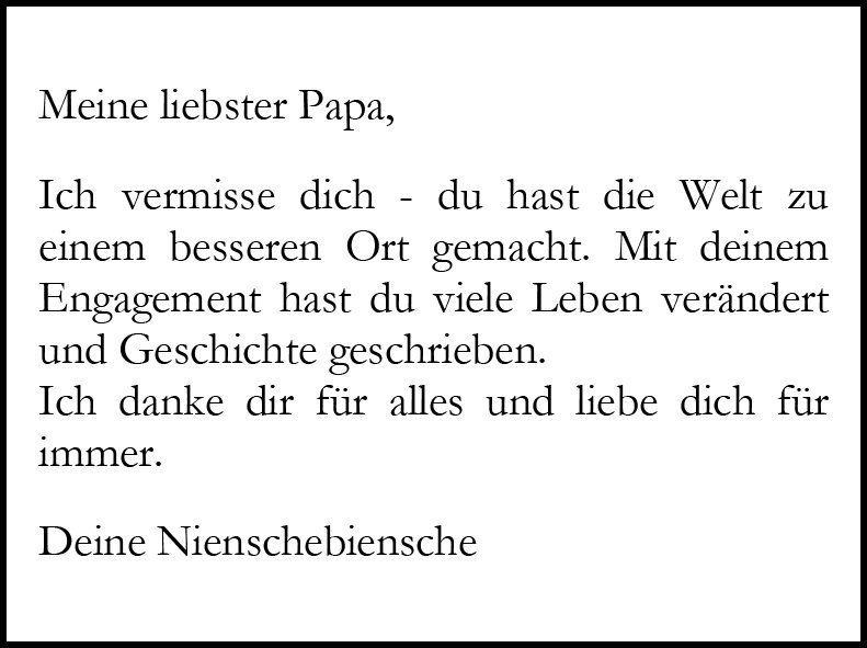 in diesen Tagen fühlen wir mit Ihnen und wünschen Ihnen von Herzen, dass Sie aus den glücklichen Erinnerungen Kraft schöpfen, um positiv in die Zukunft zu gehen. Diese Gedenkseite möge Ihnen dabei helfen, Ihre Trauer zu teilen und das Andenken gemeinsam wachzuhalten.