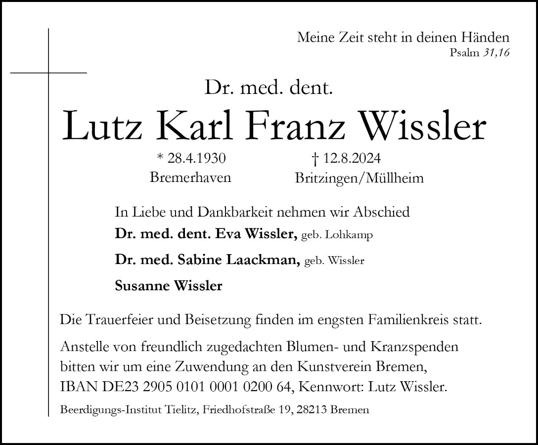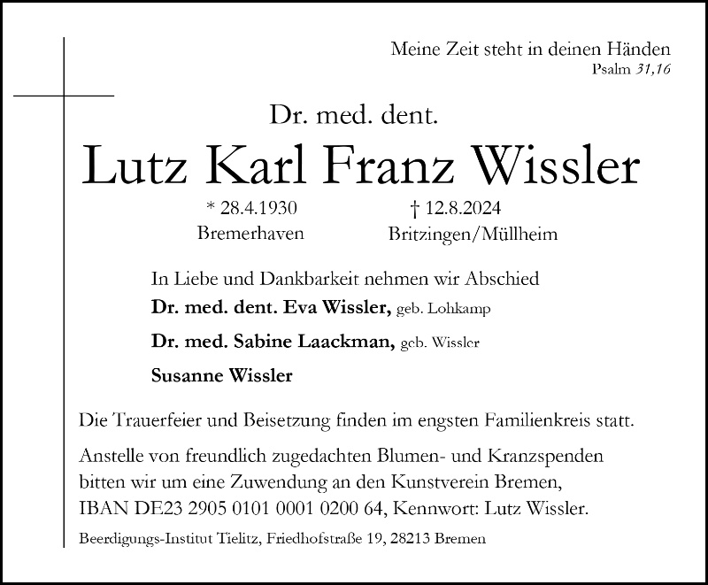 Herr Dr. Wissler ist der erste und danach auch erst einmal der letzte Zahnarzt gewesen, zu dem ich seinerzeit ein Vertrauen aufbauen konnte und den ich ohne große Angst konsultiert habe. Als mir Dr. Wissler eines Tages nach Abschluss einer Behandlung eröffnete, "dass er nun aufhören würde", war ich zunächst sprachlos. Was ich bisher nicht wusste, ist, dass Herr. Dr. Wissler in Bremerhaven geboren wurde. Rückblickend komme ich jedoch zu der Feststellung, dass sein Geburtsort zu seiner liebenswerten, zurückhaltenden und auch hanseatischen Art gepasst hat. An den Verstorbenen werde ich immer mal wieder zurückdenken, begleitet von der Tatsache, dass ich nurmehr seit 2014 zu einer Zahnärztin meines Vertrauens gehe.